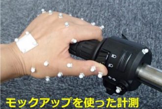 - 【写真1】 赤外線反射マーカを手(30個)および モックアップ(3個以上)の双方に貼付し、 光学式モーションキャプチャ装置で計測